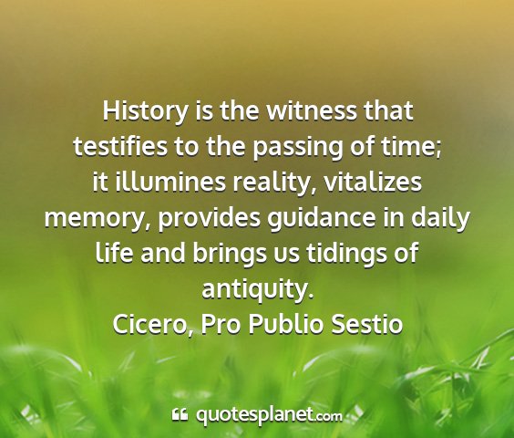 History is the witness that testifies to the passing of time; it illumines reality, vitalizes memory, provides guidance in daily life and brings us tidings of antiquity.Cicero, Pro Publio Sestio