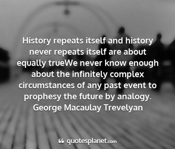 History repeats itself and history never repeats itself are about equally trueWe never know enough about the infinitely complex circumstances of any past event to prophesy the future by analogy.George Macaulay Trevelyan