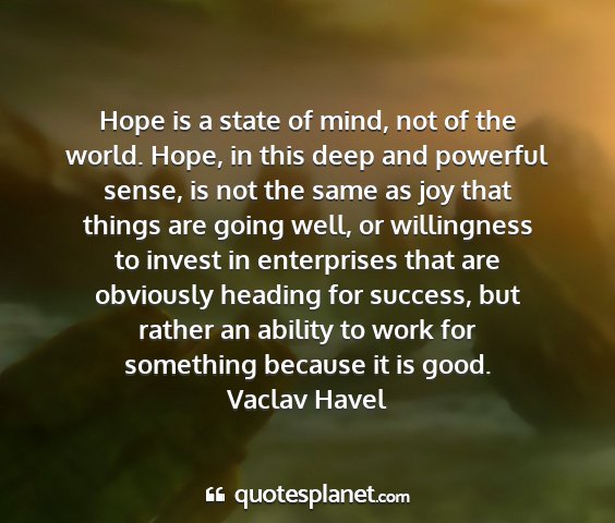 Hope is a state of mind, not of the world. Hope, in this deep and powerful sense, is not the same as joy that things are going well, or willingness to invest in enterprises that are obviously heading for success, but rather an ability to work for something because it is good.Vaclav Havel