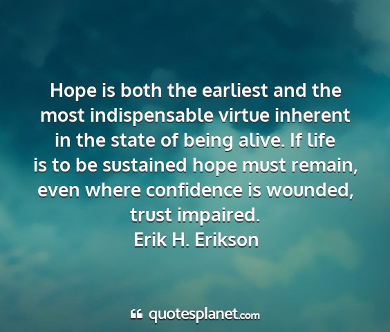 Hope is both the earliest and the most indispensable virtue inherent in the state of being alive. If life is to be sustained hope must remain, even where confidence is wounded, trust impaired.Erik H. Erikson