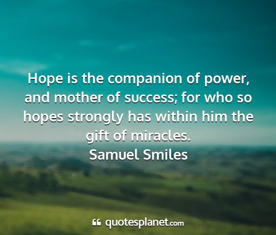 Hope is the companion of power, and mother of success; for who so hopes strongly has within him the gift of miracles.Samuel Smiles