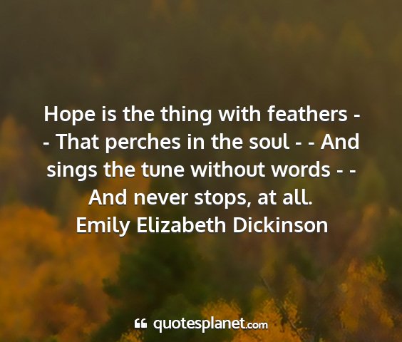 Hope is the thing with feathers - - That perches in the soul - - And sings the tune without words - - And never stops, at all.Emily Elizabeth Dickinson