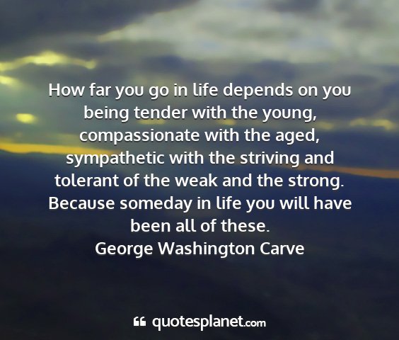 How far you go in life depends on you being tender with the young, compassionate with the aged, sympathetic with the striving and tolerant of the weak and the strong. Because someday in life you will have been all of these.George Washington Carve