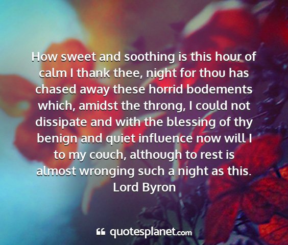 How sweet and soothing is this hour of calm I thank thee, night for thou has chased away these horrid bodements which, amidst the throng, I could not dissipate and with the blessing of thy benign and quiet influence now will I to my couch, although to rest is almost wronging such a night as this.Lord Byron
