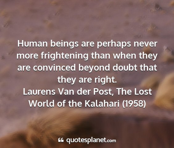 Human beings are perhaps never more frightening than when they are convinced beyond doubt that they are right.Laurens Van der Post, The Lost World of the Kalahari (1958)