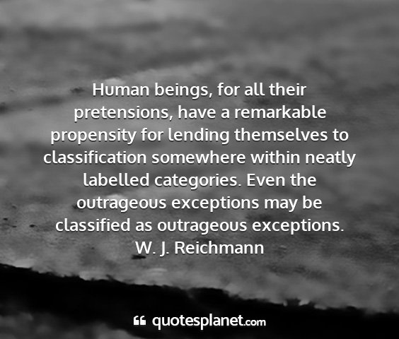 Human beings, for all their pretensions, have a remarkable propensity for lending themselves to classification somewhere within neatly labelled categories. Even the outrageous exceptions may be classified as outrageous exceptions.W. J. Reichmann