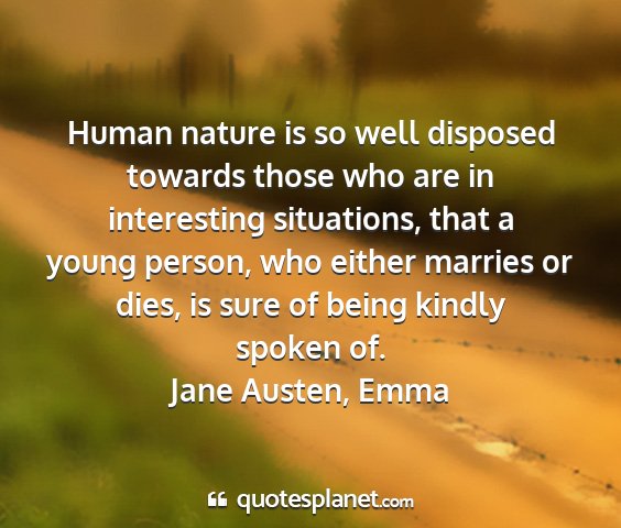 Human nature is so well disposed towards those who are in interesting situations, that a young person, who either marries or dies, is sure of being kindly spoken of.Jane Austen, Emma