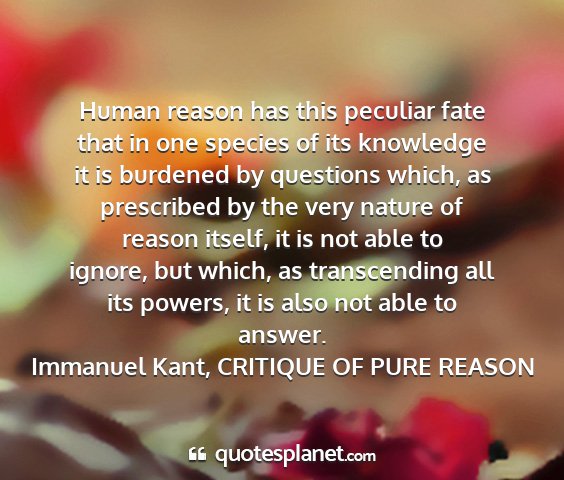 Human reason has this peculiar fate that in one species of its knowledge it is burdened by questions which, as prescribed by the very nature of reason itself, it is not able to ignore, but which, as transcending all its powers, it is also not able to answer.Immanuel Kant, CRITIQUE OF PURE REASON