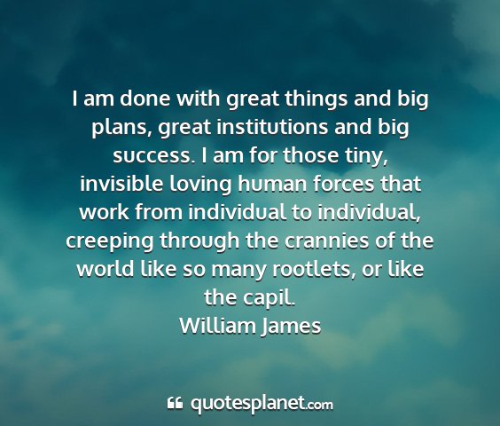 I am done with great things and big plans, great institutions and big success. I am for those tiny, invisible loving human forces that work from individual to individual, creeping through the crannies of the world like so many rootlets, or like the capil.William James