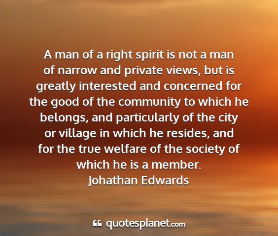 A man of a right spirit is not a man of narrow and private views, but is greatly interested and concerned for the good of the community to which he belongs, and particularly of the city or village in which he resides, and for the true welfare of the society of which he is a member.Johathan Edwards