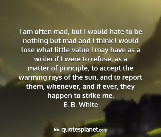 I am often mad, but I would hate to be nothing but mad and I think I would lose what little value I may have as a writer if I were to refuse, as a matter of principle, to accept the warming rays of the sun, and to report them, whenever, and if ever, they happen to strike me.E. B. White