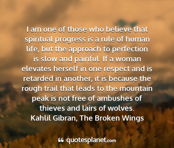 I am one of those who believe that spiritual progress is a rule of human life, but the approach to perfection is slow and painful. If a woman elevates herself in one respect and is retarded in another, it is because the rough trail that leads to the mountain peak is not free of ambushes of thieves and lairs of wolves.Kahlil Gibran, The Broken Wings