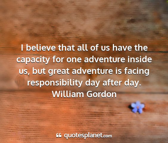 I believe that all of us have the capacity for one adventure inside us, but great adventure is facing responsibility day after day.William Gordon