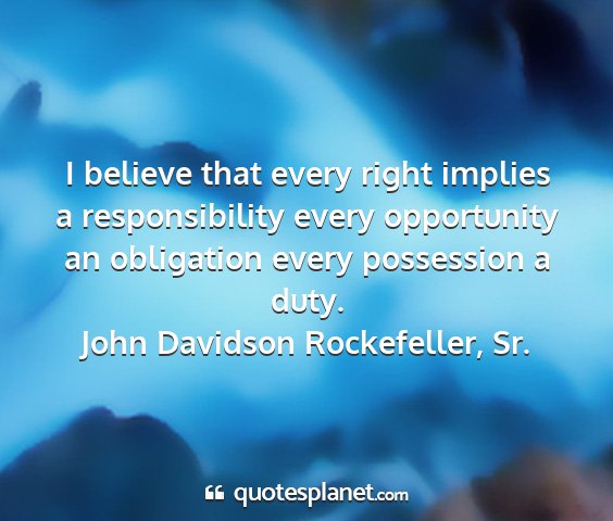 I believe that every right implies a responsibility every opportunity an obligation every possession a duty.John Davidson Rockefeller, Sr.