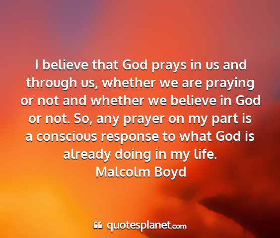 I believe that God prays in us and through us, whether we are praying or not and whether we believe in God or not. So, any prayer on my part is a conscious response to what God is already doing in my life.Malcolm Boyd