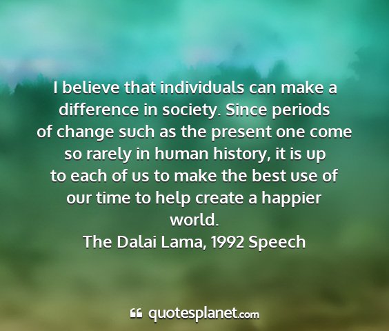 I believe that individuals can make a difference in society. Since periods of change such as the present one come so rarely in human history, it is up to each of us to make the best use of our time to help create a happier world.The Dalai Lama, 1992 Speech