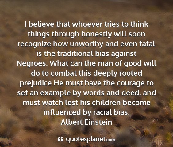 I believe that whoever tries to think things through honestly will soon recognize how unworthy and even fatal is the traditional bias against Negroes. What can the man of good will do to combat this deeply rooted prejudice He must have the courage to set an example by words and deed, and must watch lest his children become influenced by racial bias.Albert Einstein