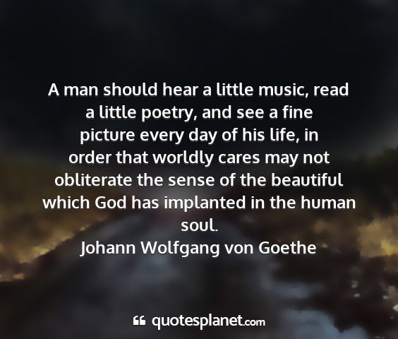 A man should hear a little music, read a little poetry, and see a fine picture every day of his life, in order that worldly cares may not obliterate the sense of the beautiful which God has implanted in the human soul.Johann Wolfgang von Goethe