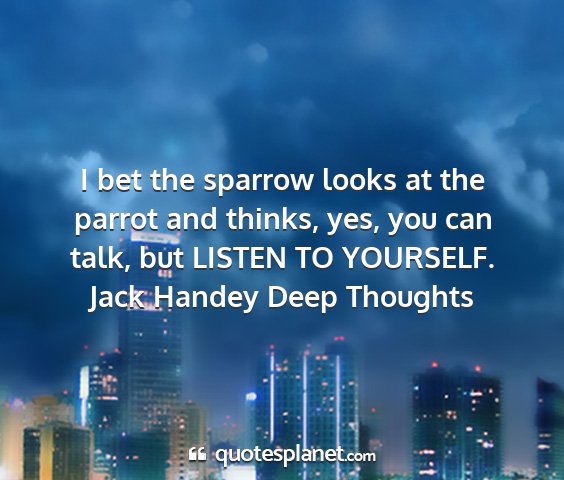 I bet the sparrow looks at the parrot and thinks, yes, you can talk, but LISTEN TO YOURSELF.Jack Handey Deep Thoughts