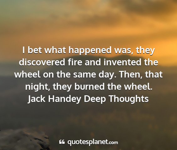 I bet what happened was, they discovered fire and invented the wheel on the same day. Then, that night, they burned the wheel.Jack Handey Deep Thoughts