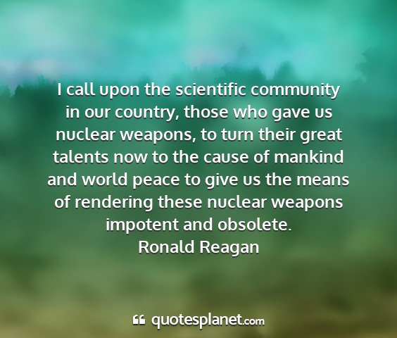 I call upon the scientific community in our country, those who gave us nuclear weapons, to turn their great talents now to the cause of mankind and world peace to give us the means of rendering these nuclear weapons impotent and obsolete.Ronald Reagan