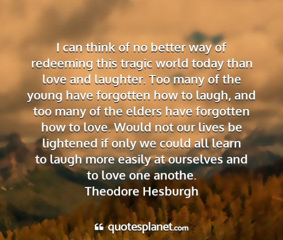 I can think of no better way of redeeming this tragic world today than love and laughter. Too many of the young have forgotten how to laugh, and too many of the elders have forgotten how to love. Would not our lives be lightened if only we could all learn to laugh more easily at ourselves and to love one anothe.Theodore Hesburgh