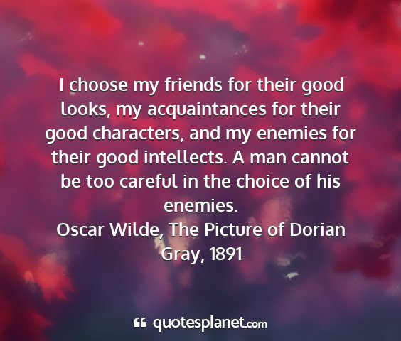 I choose my friends for their good looks, my acquaintances for their good characters, and my enemies for their good intellects. A man cannot be too careful in the choice of his enemies.Oscar Wilde, The Picture of Dorian Gray, 1891