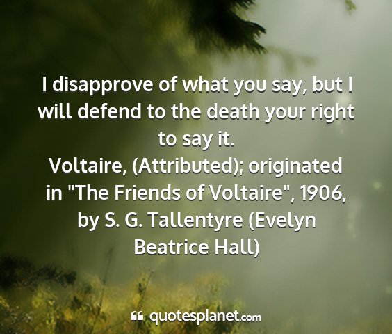 I disapprove of what you say, but I will defend to the death your right to say it.Voltaire, (Attributed); originated in "The Friends of Voltaire", 1906, by S. G. Tallentyre (Evelyn Beatrice Hall)
