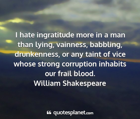 I hate ingratitude more in a man than lying, vainness, babbling, drunkenness, or any taint of vice whose strong corruption inhabits our frail blood.William Shakespeare