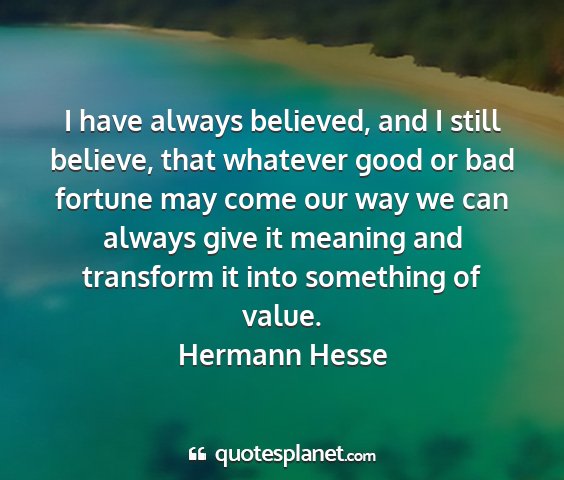 I have always believed, and I still believe, that whatever good or bad fortune may come our way we can always give it meaning and transform it into something of value.Hermann Hesse