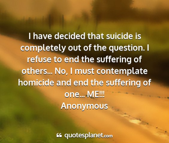 I have decided that suicide is completely out of the question. I refuse to end the suffering of others... No, I must contemplate homicide and end the suffering of one... ME!!!Anonymous