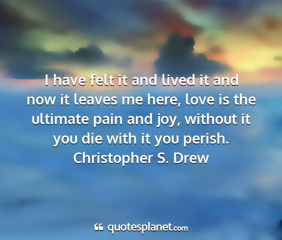 I have felt it and lived it and now it leaves me here, love is the ultimate pain and joy, without it you die with it you perish.Christopher S. Drew