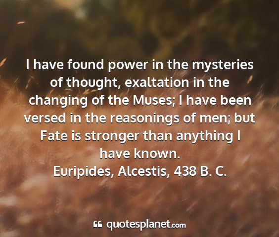 I have found power in the mysteries of thought, exaltation in the changing of the Muses; I have been versed in the reasonings of men; but Fate is stronger than anything I have known.Euripides, Alcestis, 438 B. C.