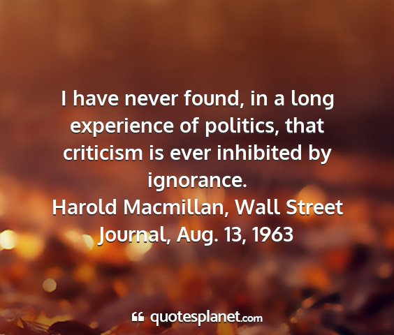 I have never found, in a long experience of politics, that criticism is ever inhibited by ignorance.Harold Macmillan, Wall Street Journal, Aug. 13, 1963