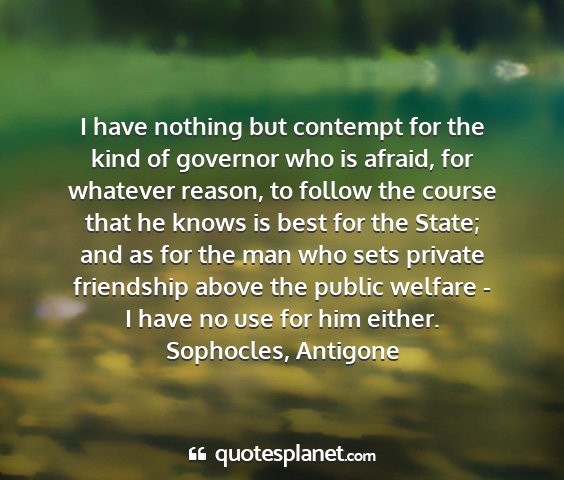 I have nothing but contempt for the kind of governor who is afraid, for whatever reason, to follow the course that he knows is best for the State; and as for the man who sets private friendship above the public welfare - I have no use for him either.Sophocles, Antigone