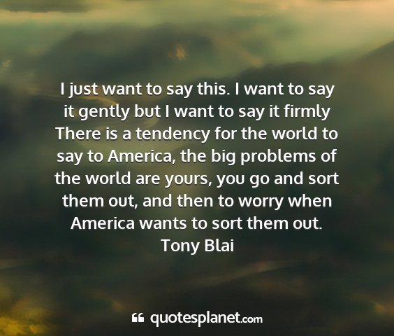 I just want to say this. I want to say it gently but I want to say it firmly There is a tendency for the world to say to America, the big problems of the world are yours, you go and sort them out, and then to worry when America wants to sort them out.Tony Blai