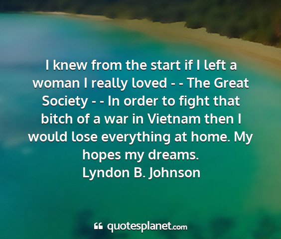 I knew from the start if I left a woman I really loved - - The Great Society - - In order to fight that bitch of a war in Vietnam then I would lose everything at home. My hopes my dreams.Lyndon B. Johnson