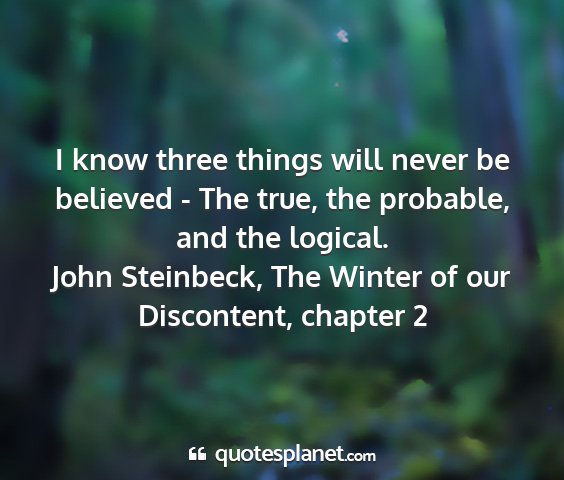 I know three things will never be believed - The true, the probable, and the logical.John Steinbeck, The Winter of our Discontent, chapter 2