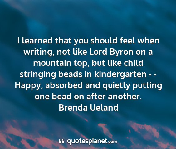 I learned that you should feel when writing, not like Lord Byron on a mountain top, but like child stringing beads in kindergarten - - Happy, absorbed and quietly putting one bead on after another.Brenda Ueland