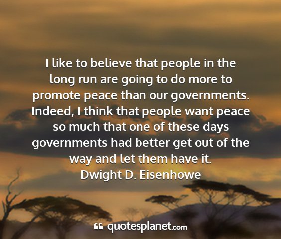 I like to believe that people in the long run are going to do more to promote peace than our governments. Indeed, I think that people want peace so much that one of these days governments had better get out of the way and let them have it.Dwight D. Eisenhowe