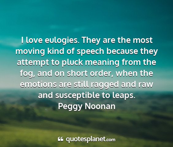 I love eulogies. They are the most moving kind of speech because they attempt to pluck meaning from the fog, and on short order, when the emotions are still ragged and raw and susceptible to leaps.Peggy Noonan