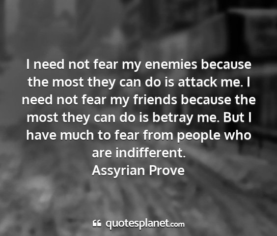 I need not fear my enemies because the most they can do is attack me. I need not fear my friends because the most they can do is betray me. But I have much to fear from people who are indifferent.Assyrian Prove