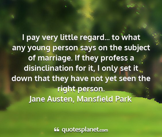 I pay very little regard... to what any young person says on the subject of marriage. If they profess a disinclination for it, I only set it down that they have not yet seen the right person.Jane Austen, Mansfield Park