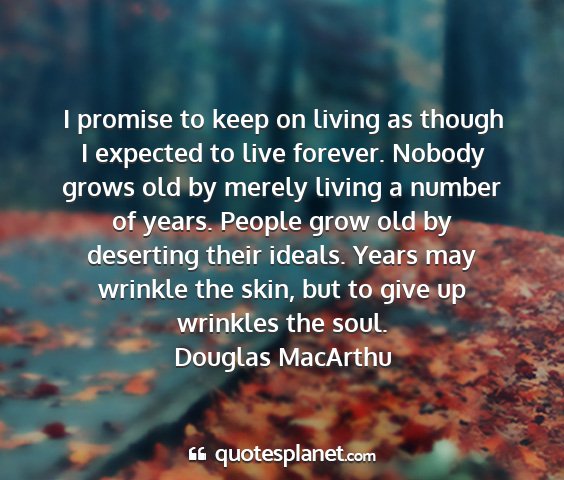 I promise to keep on living as though I expected to live forever. Nobody grows old by merely living a number of years. People grow old by deserting their ideals. Years may wrinkle the skin, but to give up wrinkles the soul.Douglas MacArthu
