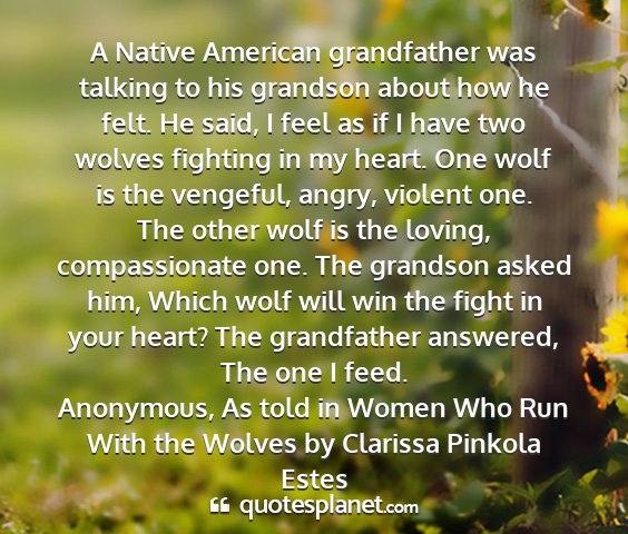 A Native American grandfather was talking to his grandson about how he felt. He said, I feel as if I have two wolves fighting in my heart. One wolf is the vengeful, angry, violent one. The other wolf is the loving, compassionate one. The grandson asked him, Which wolf will win the fight in your heart? The grandfather answered, The one I feed.Anonymous, As told in Women Who Run With the Wolves by Clarissa Pinkola Estes