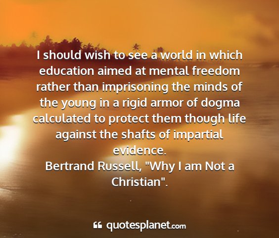 I should wish to see a world in which education aimed at mental freedom rather than imprisoning the minds of the young in a rigid armor of dogma calculated to protect them though life against the shafts of impartial evidence.Bertrand Russell, "Why I am Not a Christian".
