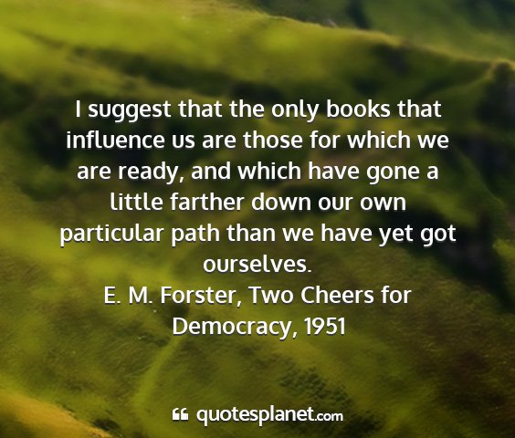 I suggest that the only books that influence us are those for which we are ready, and which have gone a little farther down our own particular path than we have yet got ourselves.E. M. Forster, Two Cheers for Democracy, 1951