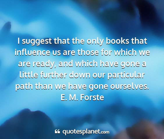 I suggest that the only books that influence us are those for which we are ready, and which have gone a little further down our particular path than we have gone ourselves.E. M. Forste