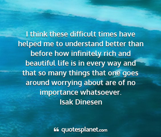 I think these difficult times have helped me to understand better than before how infinitely rich and beautiful life is in every way and that so many things that one goes around worrying about are of no importance whatsoever.Isak Dinesen
