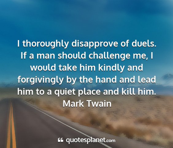 I thoroughly disapprove of duels. If a man should challenge me, I would take him kindly and forgivingly by the hand and lead him to a quiet place and kill him.Mark Twain